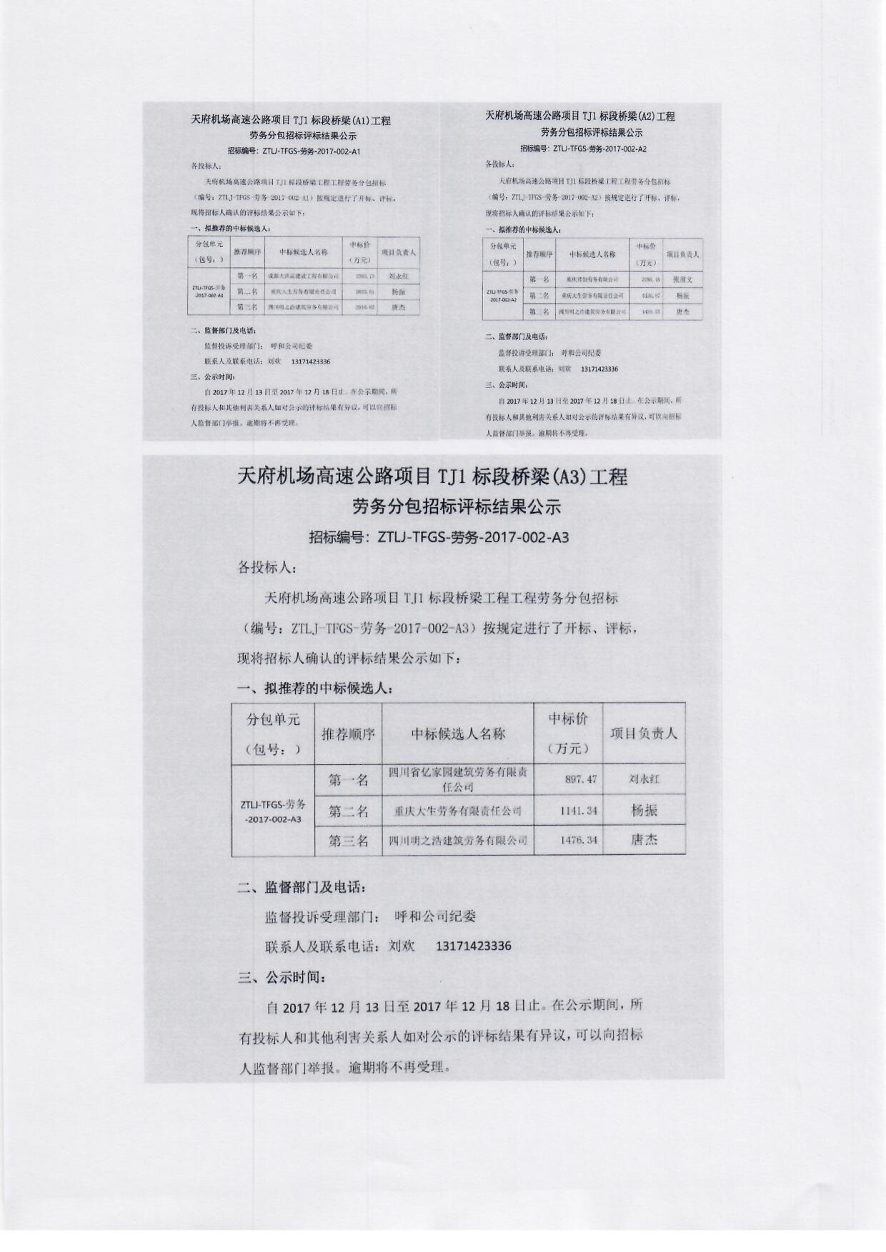 天府机场高速公路项目TJ1标段桥梁工程工程劳务分包招标 (编号:ZTLJ-TFGS-劳务-2017-002-A3)按规定进行了开标、评标,现将招标人确认的评标结果公示如下: