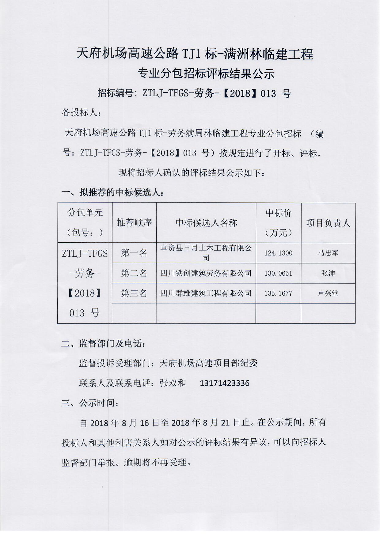 天府机场高速公路TJ1标-劳务满周林临建工程专业分包招标 (编号:ZTLJ-TFGS-劳务-【2018】013 号)按规定进行了开标、评标,现将招标人确认的评标结果公示如下: