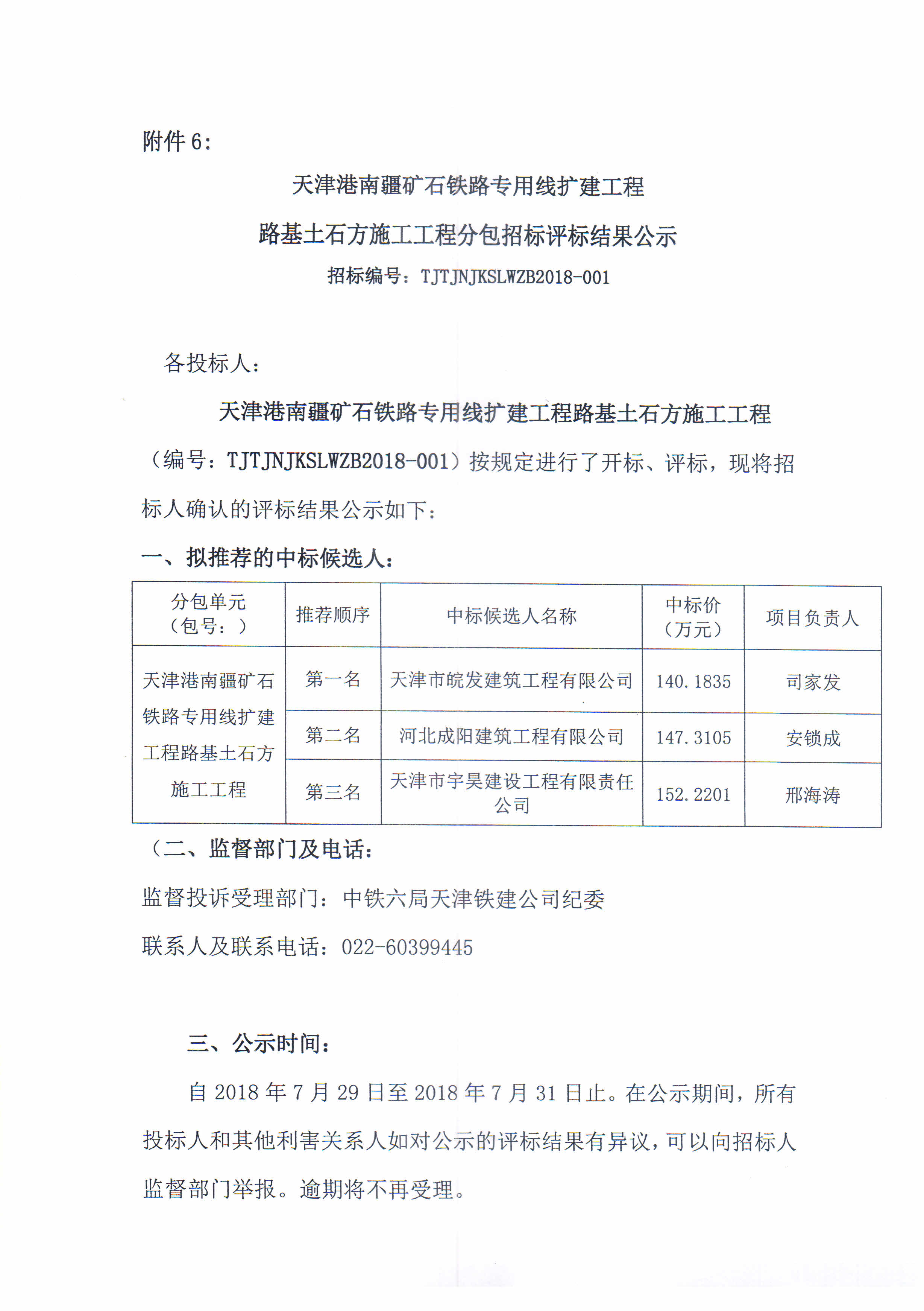 天津港南港矿石铁路专用线工程路基土石方施工工程分包评标结果