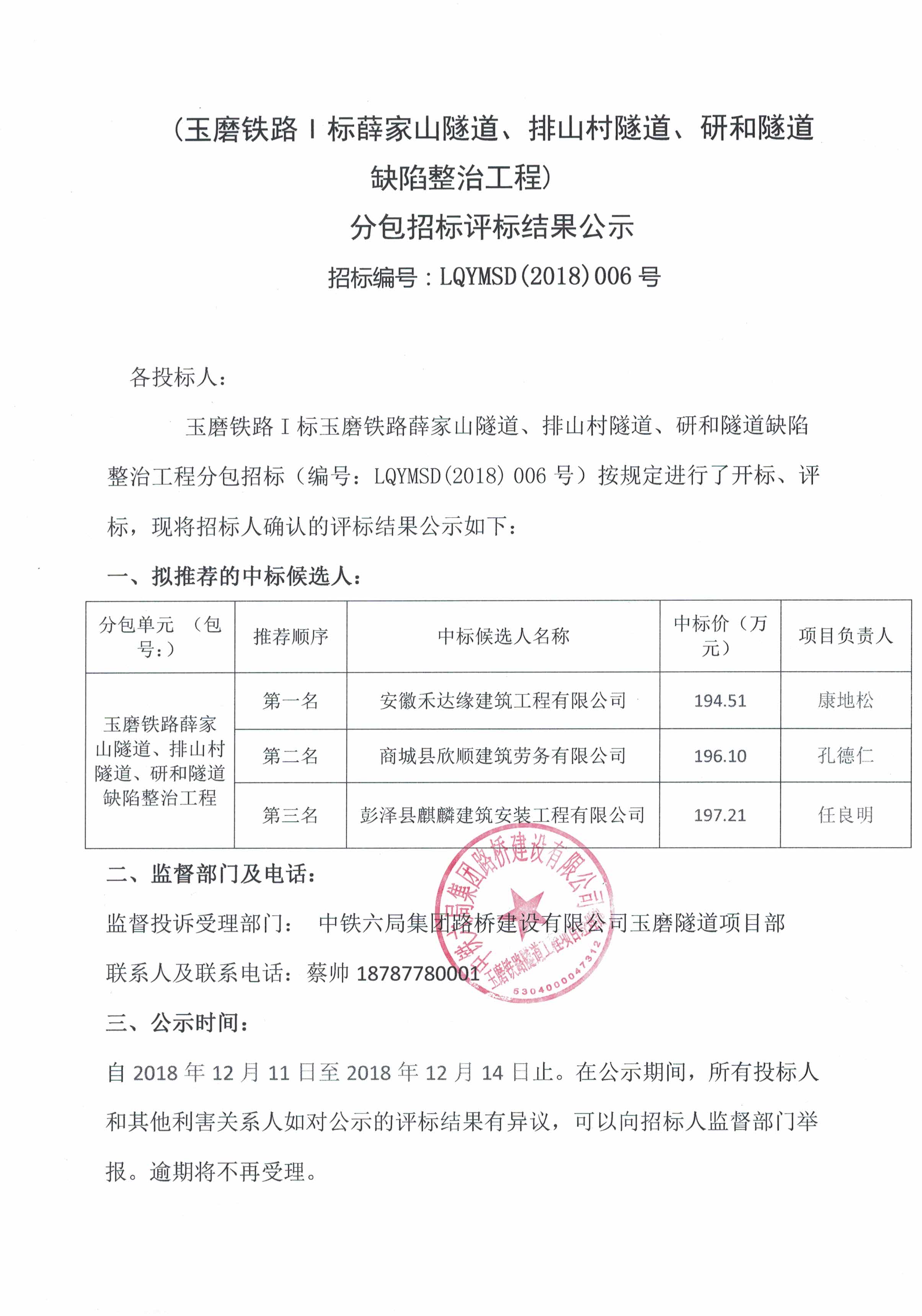 玉磨铁路I标玉磨铁路薛家山隧道、排山村隧道、研和隧道缺陷整治工程分包招标(编号:LQYMSD(2018) 006号)按规定进行了开标、评标,现将招标人确认的评标结果公示如下:
