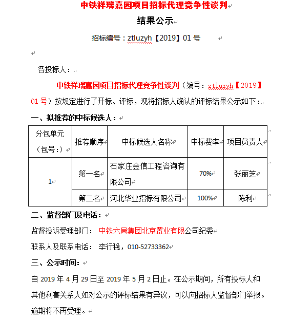 石家庄中铁祥瑞城招标代理竞争性谈判结果公示