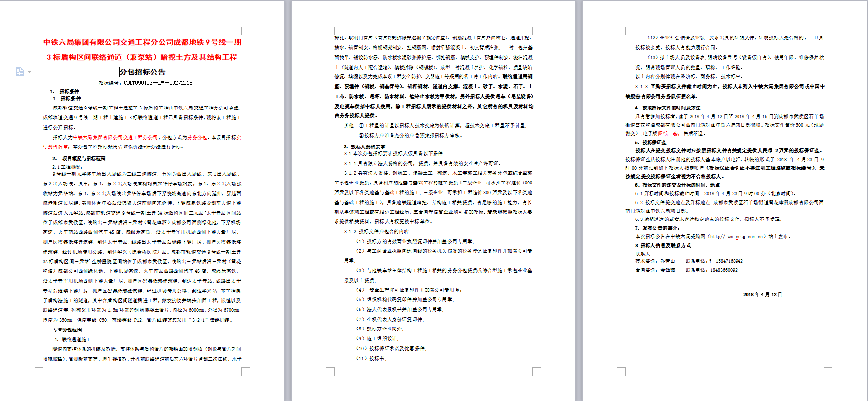 | 中铁六局集团有限公司交通工程分公司成都地铁9号线一期3标盾构区间联络通道(兼泵站)暗挖土方及其结构工程 分包招标公告 |